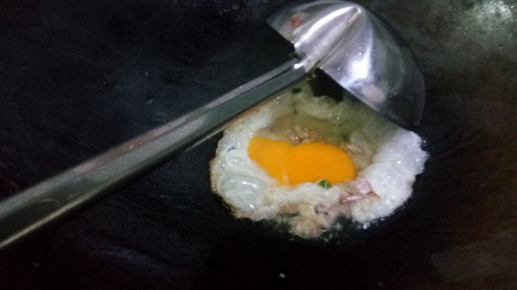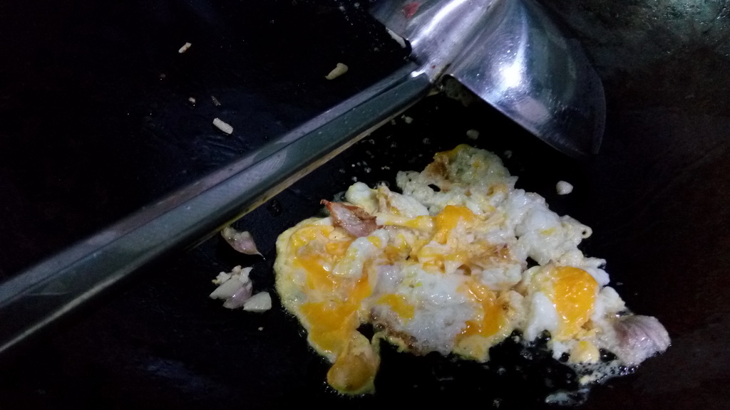 2. ตักน้ำมันหมูออกแล้วเหลือไว้สักนิด ไฟร้อน ลงไข่ แล้วตามด้วยกระเทียม