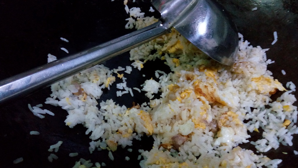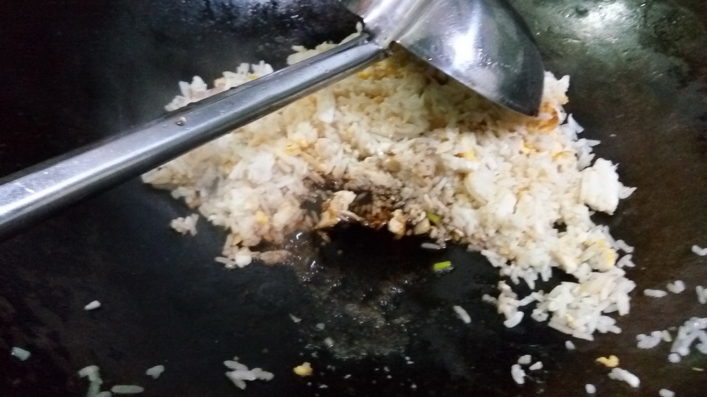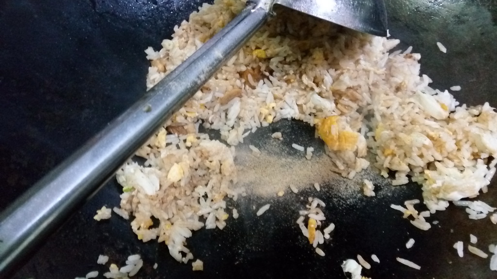 4. หรี่ไฟลงเบาๆ แล้วก็ลงซีอิ๊วขาวกับน้ำตาล แล้วค่อยคลุกข้าว แล้วเปิดไฟแรง คราวนี้ก็เขย่าอีก ให้เข้าเนื้อเลย