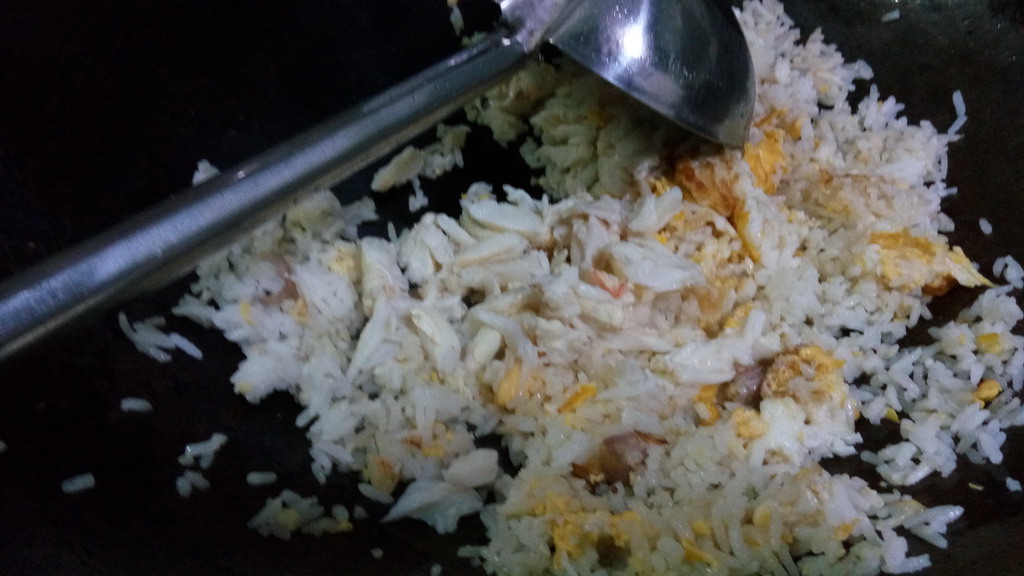 3.ลงข้าวได้เลยครับ ไฟแรงตลอด ยีข้าว เขย่าไปจนเข้ากันได้ดี ลงเนื้อปูตามได้เลย