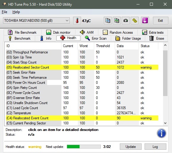 เช็คสภาพฮาร์ดดิสก์โน้ตบุ๊กเจอแถบเหลืองแบบนี้ เตรียมตัวเปลี่ยนได้หรือยังครับ