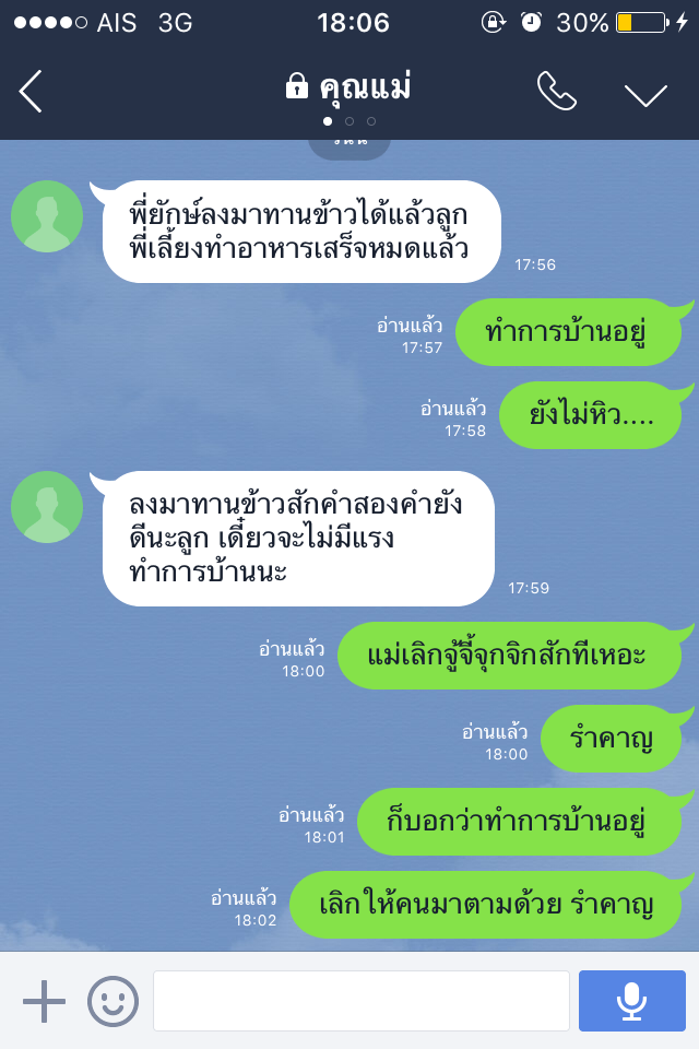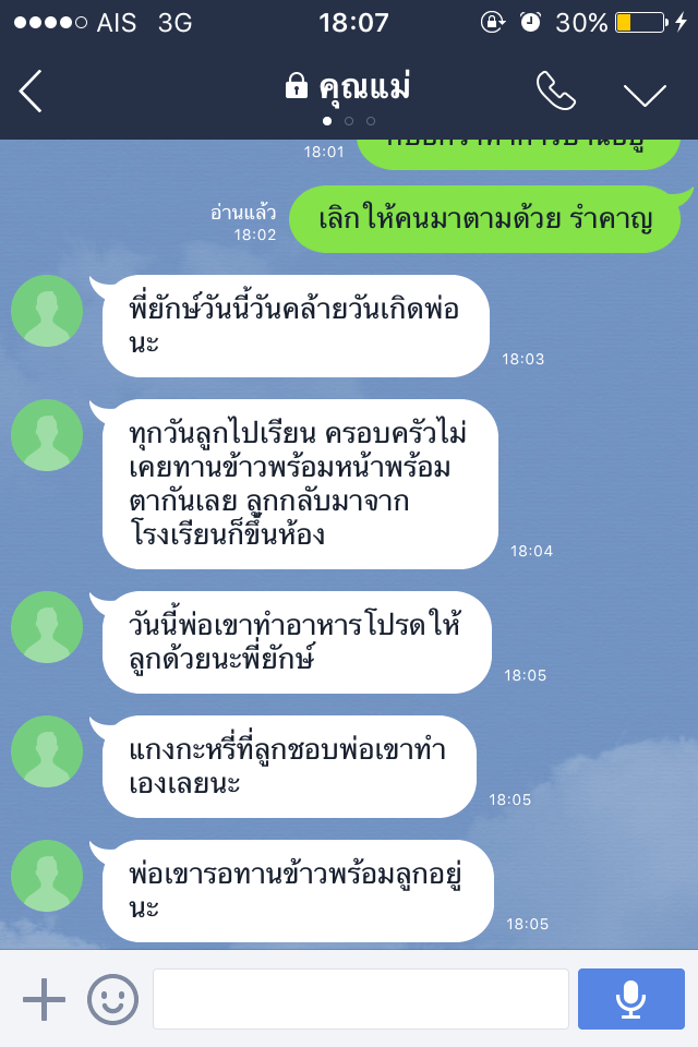 วันนี้เราไปเรียนพิเศษ (09:00-17:00) คือ เหนื่อยมาก เพลีย กลับมาบ้านก็นั่งทำการบ้านอยู่ สักพักก็มีเสียงแม่เรียกอยู่หน้าห้องบอกให้ลงไปทานข้าว เราก็ตอบว่ายังไม่หิว ประมาณครึ่งชั่วโมงก็มีคนมาเรียกอีก(พี่เลี้ยง) เราเริ่มรู้สึกรำคาญ เราก็บอกว่ายังไม่หิว ไม่นานเห็นไลน์แม่ แม่บอกให้ลงไปทานข้าว แล้วเราก็คุยกับแม่(รูป)..........เราลืมไปว่าวันนี้วันเกิดพ่อ 😓😓 รู้สึกผิดมาก อยากขอโทษแม่ที่พูดแบบนั้น เรามัวแต่สนใจเรื่องการเรียน สนใจเรื่องของตัวเอง จนลืมสนใจความรู้สึกของคนในครอบครัว ที่บ้านเราไม่ได้ทานข้าวพร้อมกันมานานแล้ว ส่วนใหญ่เวลาเลิกเรียน พอถึงบ้านเราก็จะขึ้นห้อง เวลาหิวก็ลงมาหากินเอง(ประมาณสี่ห้าทุ่ม)/นอนดึก ไม่งั้นก็ลงมาตักข้าวไปกินบนห้องเลย