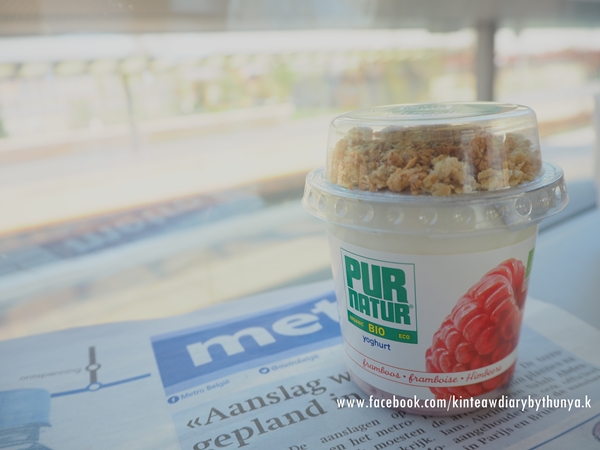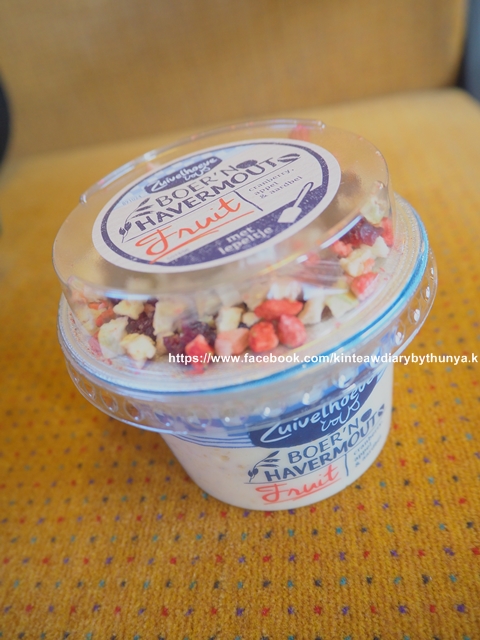 อันนี้คือ Boer’N Havermut £1.25 : หยิบมาด้วยความรีบเร่ง มองแว๊บแรก โยเกิร์ตชัว! แต่ก็แอบสงสัยว่าทำไมโยเกิรต์สีตุ่นๆมีจุดสีน้ำตาล พอเปิดกินเท่านั้นละ รู้เรื่องเลย มันคือ ข้าวโอ้ตจ้า5555...ข้างบนเป็นผลไม้อบแห้งกรอบๆ เวลากินก็เทผสมกันโลด...รสชาติก็ดีนะ อัตราส่วนของข้าวโอ๊ตกับนมผสมกันมาลงตัวอะ ไม่แห้งไม่เหลวไป รสชาติตัวข้าวโอ๊ตจะจืดๆหวานนิดๆ พอกินกับผลไม้แห้ง ก้เข้ากันดี