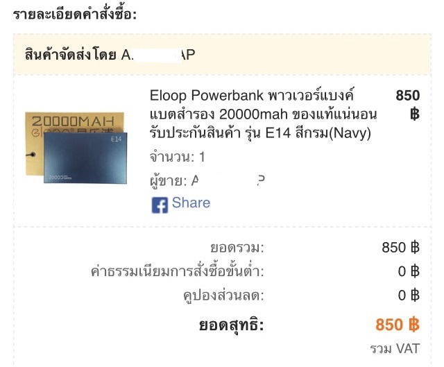 วันที่ 4 ก.ย. 59 ดิฉันได้สั่ง พาวเวอร์แบงค์ Eloop รุ่น E14 สีกรม กับเวบLAZADA ราคา 850 บาท