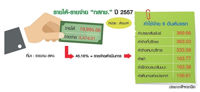 สำหรับค่าใช้จ่ายประจำปี2557ที่สูงเป็นอันดับ 1 คือ ค่าใช้จ่ายในการดำเนินงาน รวม 2,471.90 ล้านบาท หรือ 45.15% โดยในส่วนนี้ค่าใช้จ่ายในการประชาสัมพันธ์ยังสูงเป็นอันดับ 1 คือ 369.66 ล้านบาท รองลงไปคือค่าจ้างที่ปรึกษา 363.03 ล้านบาท ค่าจ้างเหมาบริการ 333.58 ล้านบาท