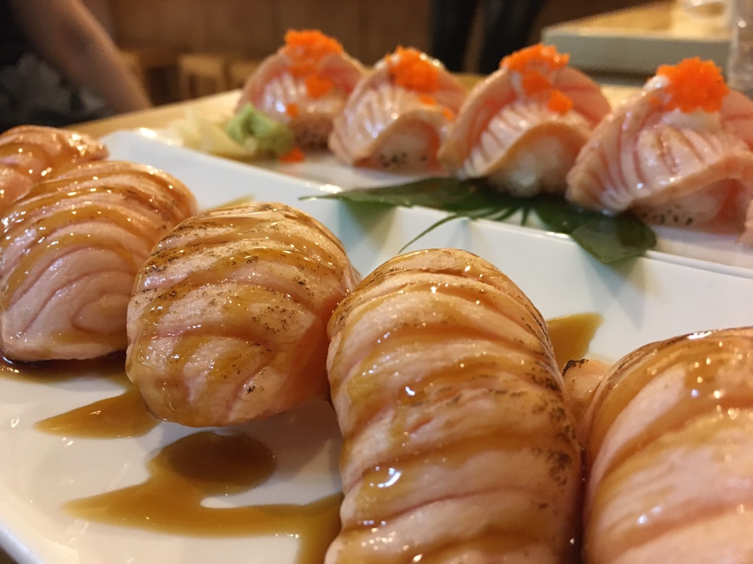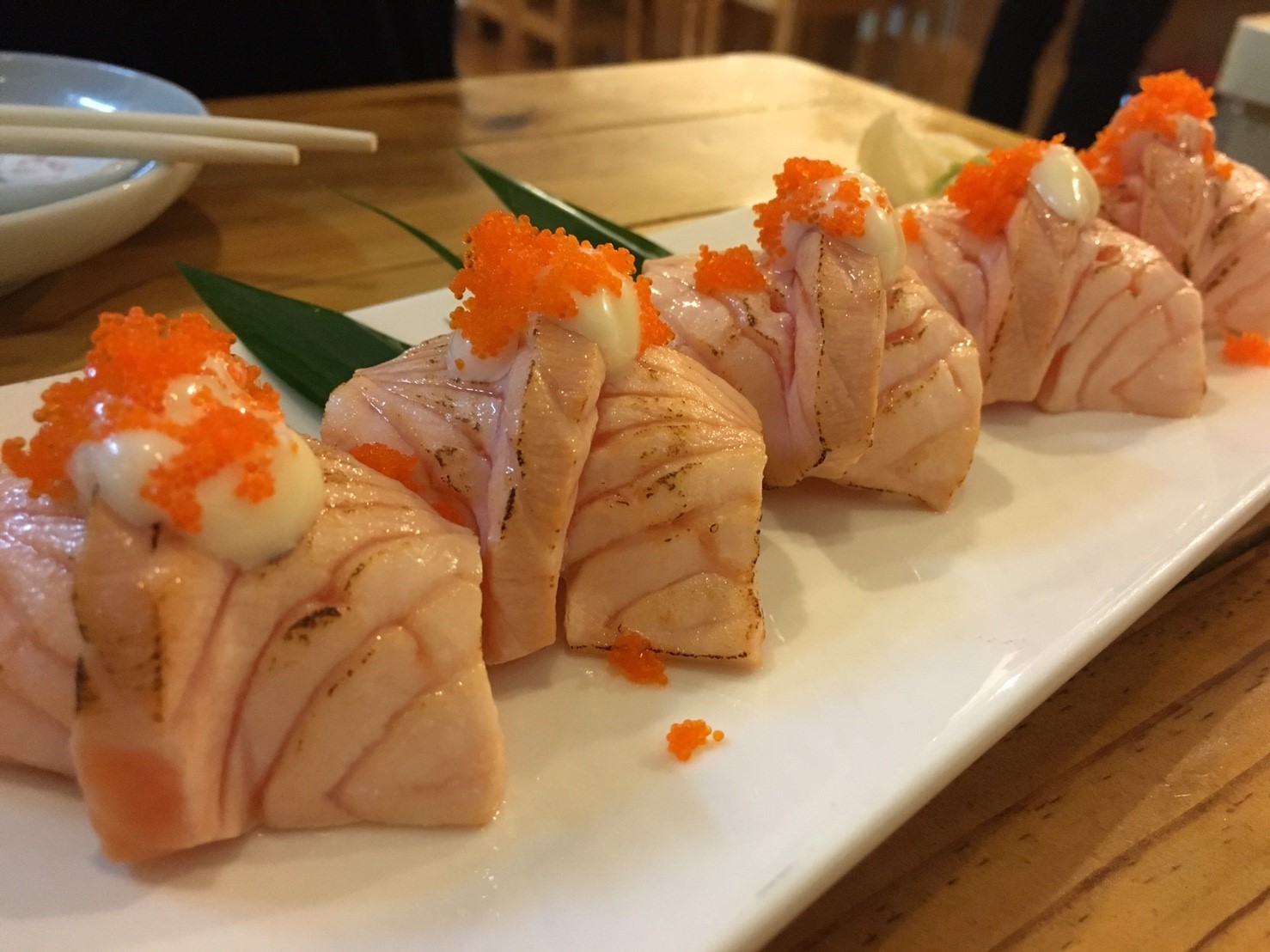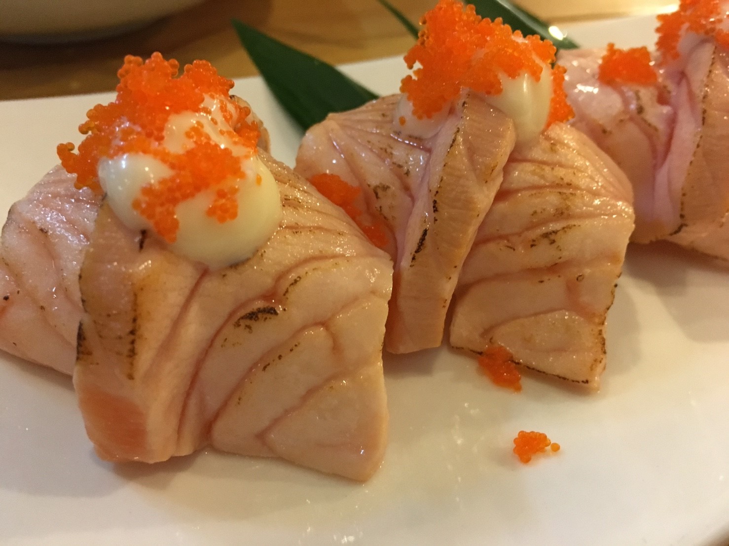 -ปลาเเซลมอนพ่นไฟอร่อยค่ะ ปลาจะค่อนข้างสุกนิ่มๆ โปะด้วยซอยมายองเนสเเละไข่กุ้ง เมนูนี้อาจจะเหมาะกับคนที่ไม่ค่อยชอบทานซาชิมิ