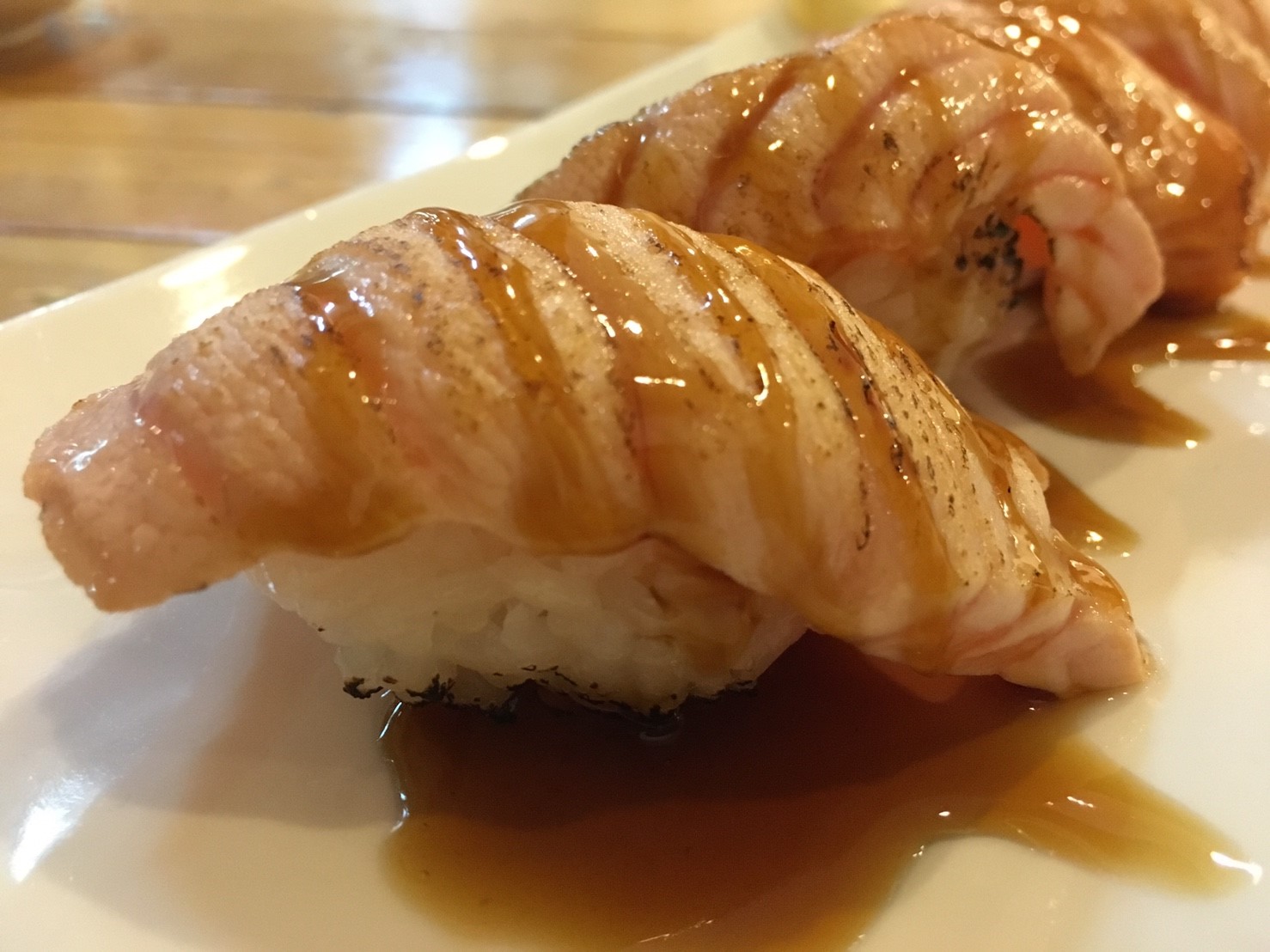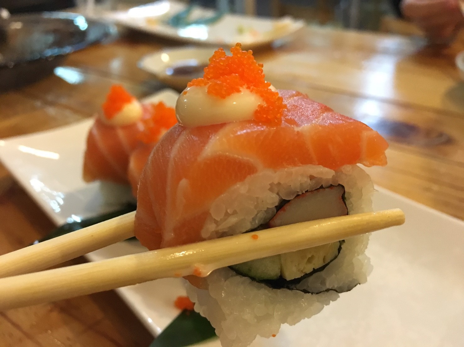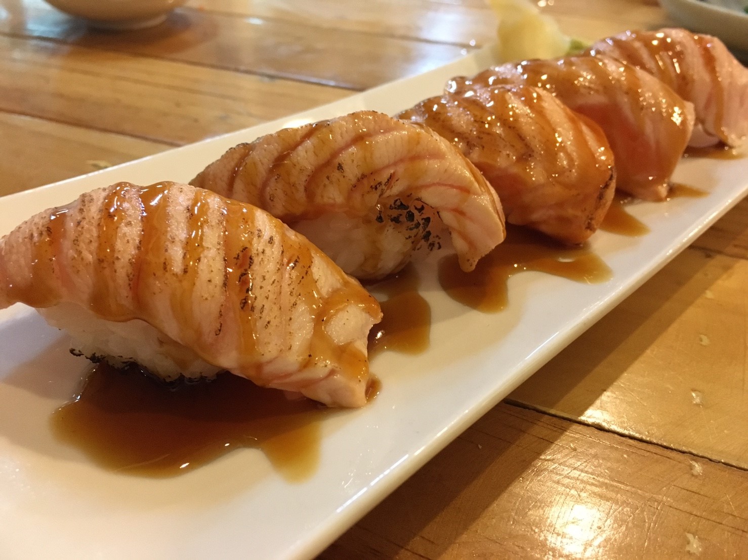 -ปลาเเซลมอนพ่นไฟอร่อยค่ะ ปลาจะค่อนข้างสุกนิ่มๆ โปะด้วยซอยมายองเนสเเละไข่กุ้ง เมนูนี้อาจจะเหมาะกับคนที่ไม่ค่อยชอบทานซาชิมิ