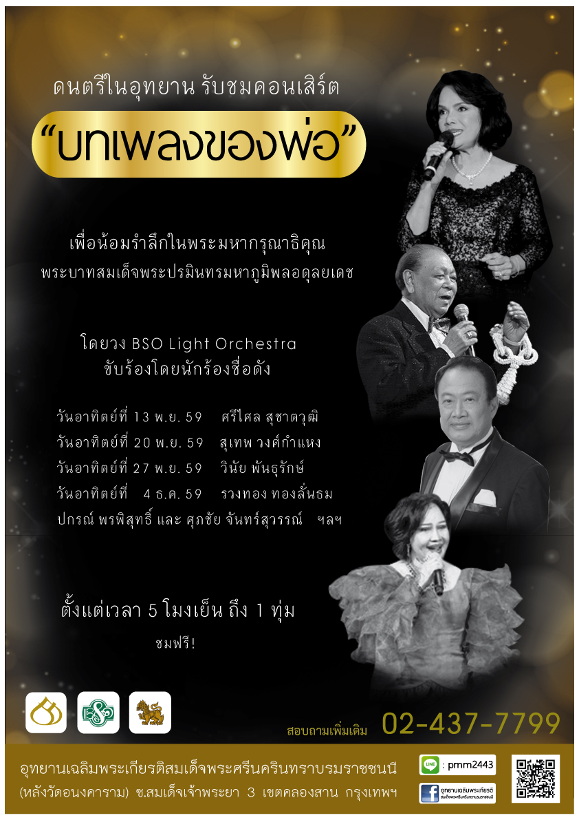อุทยานเฉลิมพระเกียรติสมเด็จพระศรีนครินทราบรมราชชนนี จัดคอนเสิร์ต ดนตรีในอุทยาน โดยนำเสนอ “บทเพลงของพ่อ” เพื่อน้อมรำลึกถึงพระมหากรุณาธิคุณในพระบาทสมเด็จพระปรมินทรมหาภูมิพลอดุลยเดช