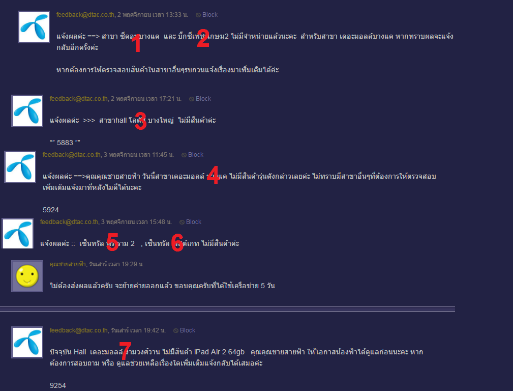 เริ่มแรกประทับใจกับการให้บริการของ Dtac ในหลังไมค์มาก จึงตัดสินใจย้ายค่ายเพื่อที่จะซื้อ iPad Air2 กับ Dtac หลังจากนั้นได้สอบถามกับ Dtac ว่าสาขาที่ใกล้เคียงมีสินค้าหรือไม่คำตอบที่ได้รับเป็นเช่นนี้