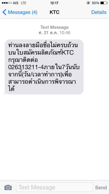 คุณแม่สมัครบัตรเครดิตไปประมาณช่วงกลางเดือนตุลาคม มี sms แจ้งมาว่า ท่านลงลายมือไม่ครบถ้วน วันที่ 21 ต.ค.