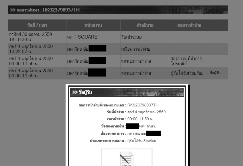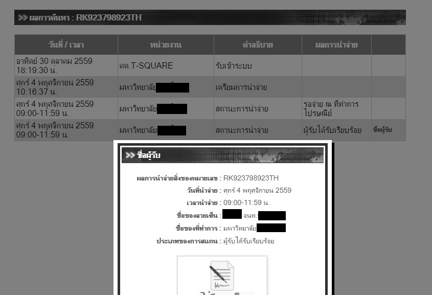 แล้วระบบไปรษณีย์ไทยขึ้นว่า ถึงมือผู้รับ (รับโดย จนท.แต่ละสำนัก) เมื่อวันที่ 4/11/2559 เมื่อ 9.00-11.59 น. แล้วตำแหน่งที่สมัครถ้าเอาจริงๆ หมดวันที่ 4/11/59 กับ 31/10/59 (ถึงตำแหน่งที่หมด 31/10/59 อันนี้พอจะเข้าใจ แต่นอกนั้นไม่)
