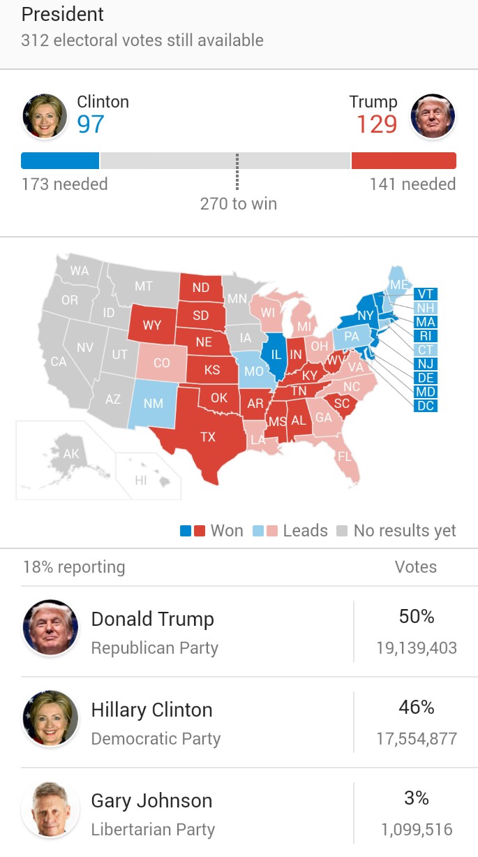 ดูใน CNN ตอนนี้เลยครับ คลินตันได้ราวๆ 8 ล้าน ทรัมป์ได้ 9 ล้าน แต่คลินตันนำด้านอีเลคทอรัลโหวต คือ 86 ส่วนทรัมป์ได้ 46 ไม่น่าเชื่อว่าทรัมป์จะมีคนเลือกมากขนาดนั้น