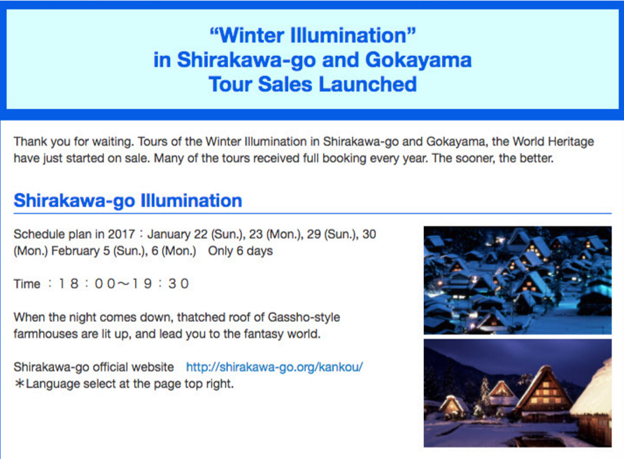 => ส่วนใครที่พลาดหวังจากงาน Light-up ที่ Shirakawa-go ยังมีงานประดับไฟที่ Miyama ตั้งแต่ช่วง ม.ค. - ปลายเดือน ก.พ.