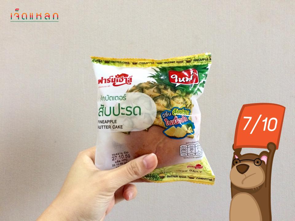 - หน้าห่อเคลมว่ามีชิ้นสับปะรดในเนื้อเค้ก หมีก็คิดเองว่าน่าจะกัดแล้วเจอสับปะรดทุกคำอะไรแบบนั้น แต่เอาเข้าจริงๆ ก็เจอชิ้นสับปะรดน้อยไปหน่อยฮะ หลบซ่อนอยู่ในเนื้อเค้กค่อนข้างหร็อมแหร็ม ยังดีที่เค้กหอมและฉ่ำเนยนิดๆ เนื้อเค้กไม่แห้งจนเกินไป กับรสหวานกำลังดี เลยพอถูไถรอดตัวไปได้ฮะ!