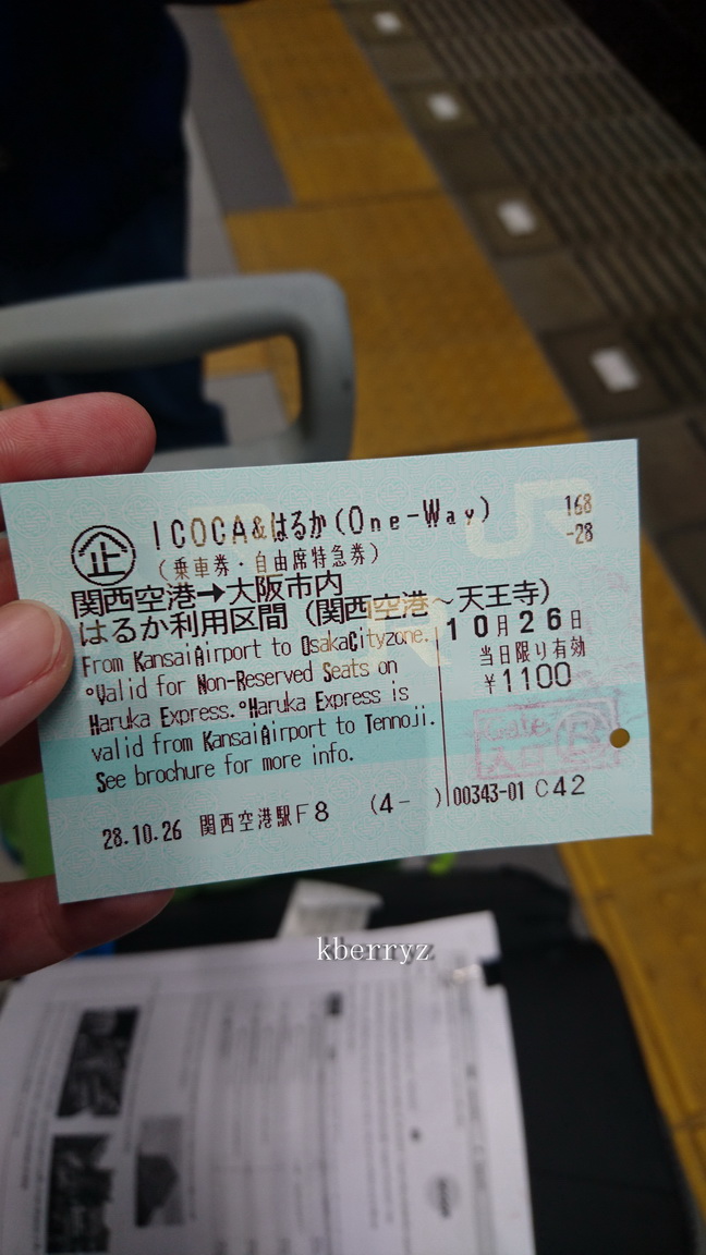 Day 1 26 ต.ค. 59 บินเวลา 9.25 น. ถึงโอซาก้า ประมาณ 5 โมงเย็น บวก 2 ชม เวลาญี่ปุ่น (ถ้าไทยก็บ่าย 3) ผ่าน ตม (ถามเบอร์โทรโรงแรมด้วยนะเตรียมไปเผื่อไว้ด้วยค่ะ) รอกระเป๋า ไม่นาน แล้วก็รีบออกไปหา JR-WEST Ticket Office เพื่อไปแลกบัตร ICOCA เพื่อใช้เดินทางในโอซาก้า ขึ้นบันไดเลื่อนไปชั้น 2 แล้วเดินออกไปข้างนอกอยู่ซ้ายมือ เดินไปถูกเฉยเลยเพราะว่าดูวิดีโอรีวิวเที่ยวก่อนมาหาไม่ยากค่ะ วางแผนการเดินทางภายในเมืองว่าจะใช้อะไรดี ซื้อ pass ดีไหม สรุปกันว่าไม่ซื้อละกัน ใช้เป็นบัตร ICOCA ดีกว่า