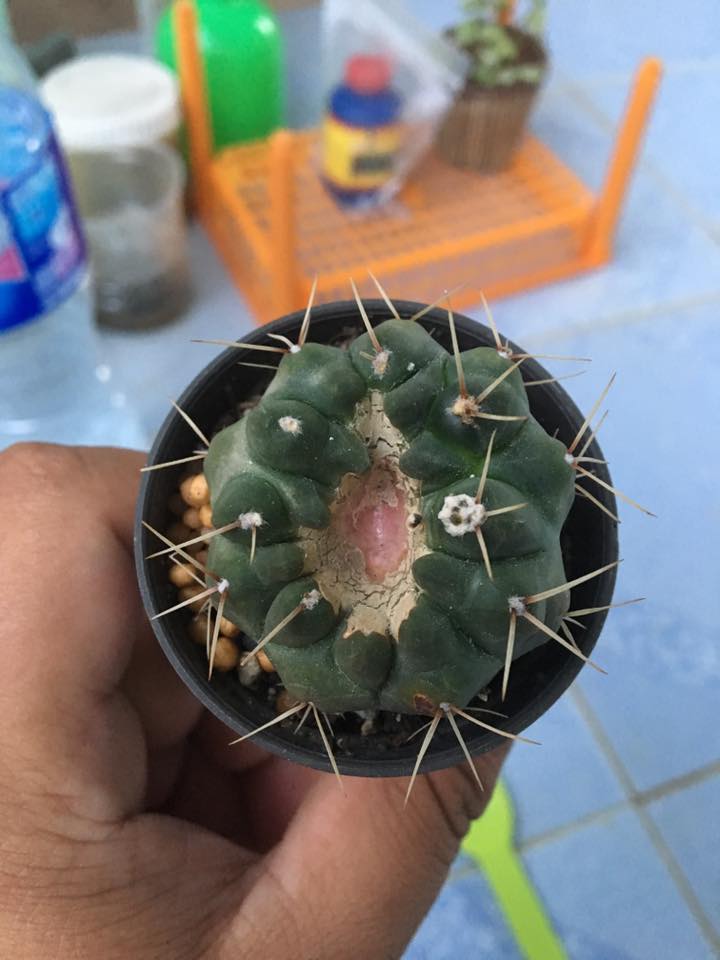 แคคตัสที่ซื้อมามีอาการไม่ค่อยดีค่ะ ไม่ทราบว่าทราบสาเหตุและวิธีรักษามั๊ยคะ ต้นแรกยิมโนหัวสี ส่วนที่เป็นยิมโนมีจุดสีน้ำตาล รวมถึงมีรอยด่างสีออกขาว และส่วนที่ใกล้กับตอเป็นลักษณะเริ่มเหี่ยวย่นค่ะ
