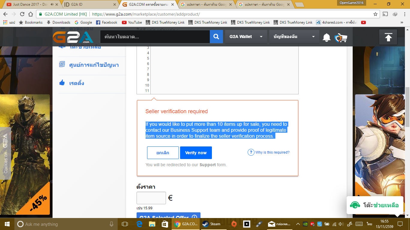 ผมขายเกมมา 9 คีย์แล้ว แต่พอจะขายอันที่ 10 กลับขายไม่ได้ มันบอกว่า (If you would like to put more than 10 items up for sale, you need to contact our Business Support team and provide proof of legitimate item source in order to finalize the seller verification process.) ผมก็เลยไปสอบถาม Support มันก็บอกว่าให้ส่งรูปหลักฐานไปผมก็ส่งไปแล้วมันก็เงียบไปตอบอะไรอีก
