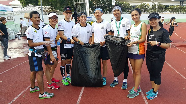 ด้วยความสงสัยเลยเข้าไปถามกลุ่มหนึ่ง ซึ่งเค้าได้บอกกับผมว่า “ปีนี้เป็นปีแรกที่มาวิ่งงานนี้ มีเพื่อนชวนให้มาทำกิจกรรมจิตอาสา แล้วก็ให้มาวิ่งได้เราก็ตั้งใจมา วิ่ง 10 กิโลฯ แล้วก็เตรียมถุงดำกันมาเองในนามกลุ่มของเมจิ มาวิ่งก่อน เสร็จแล้วก็มาช่วยเก็บขยะภายในสนาม ถือเป็นการมาวิ่งและได้มาทำจิตอาสาเต็มตัวเป็นครั้งแรกเหมือนกัน” ผมว่าดีนะ ที่มีการรวมกลุ่มกันทำอะไรแบบนี้ดูเป็นการทำด้วยใจจริงๆ ไม่ได้สร้างภาพ