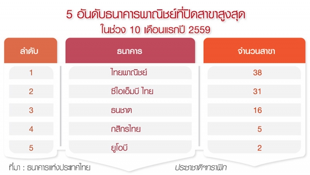 ทั้งนี้ ผู้สื่อข่าวรายงานจากข้อมูลสถิติธปท. เรื่องจำนวนสาขาของธนาคารพาณิชย์ทั้งระบบ (ซึ่งมี 22 แบงก์และสาขาธนาคารต่างประเทศ) พบว่า ในช่วง 10 เดือนที่ผ่านมา (ม.ค.-ต.ค. 2559) แบงก์พาณิชย์ลดสาขาแล้ว 42 แห่ง เมื่อเทียบกับสิ้นปีก่อนหน้าที่มีจำนวน 7,059 แห่ง ลดลงมาเหลือ 7,017 แห่ง ในเดือน ต.ค.ที่ผ่านมา