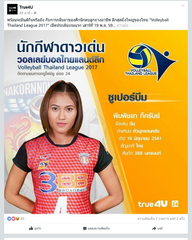 การแข่งขันวอลเลย์บอลชิงแชมป์เอเชีย รุ่นอายุไม่เกิน 19 ปี วันที่ 28 กรกฎาคม 2559 ระหว่าง ไทย กับ ญี่ปุ่น ผลไทยแพ้ 2 ต่อ 3 เซ็ต สกอร์ 25-23, 16-25, 25-19, 13-25, 11-15 "บีม พิมพิชยา" ใช้ไหวพร