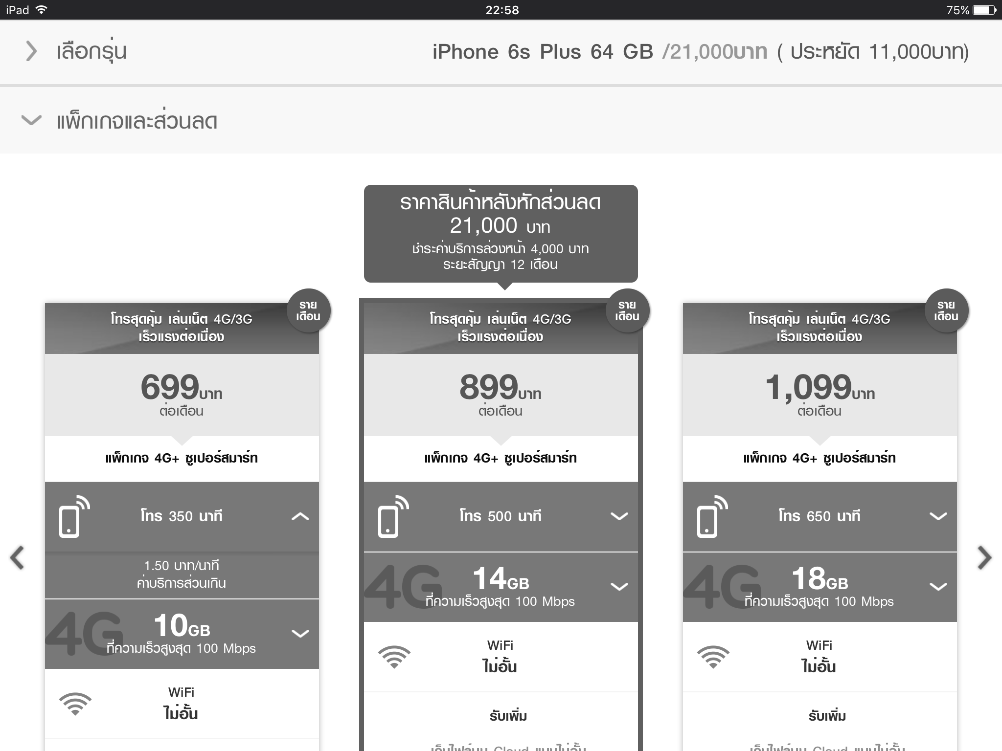 2. iPhone 6s Plus 64 GB ราคาหลังหักส่วนลด 21,000 บาท + ชำระค่ารายเดือนล่วงหน้า 4,280 บาท ครับ