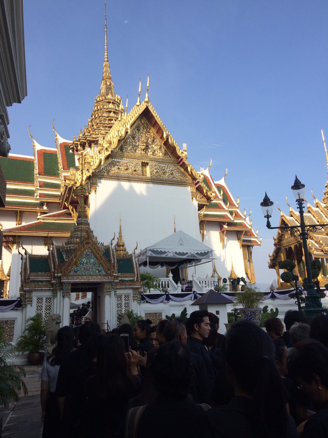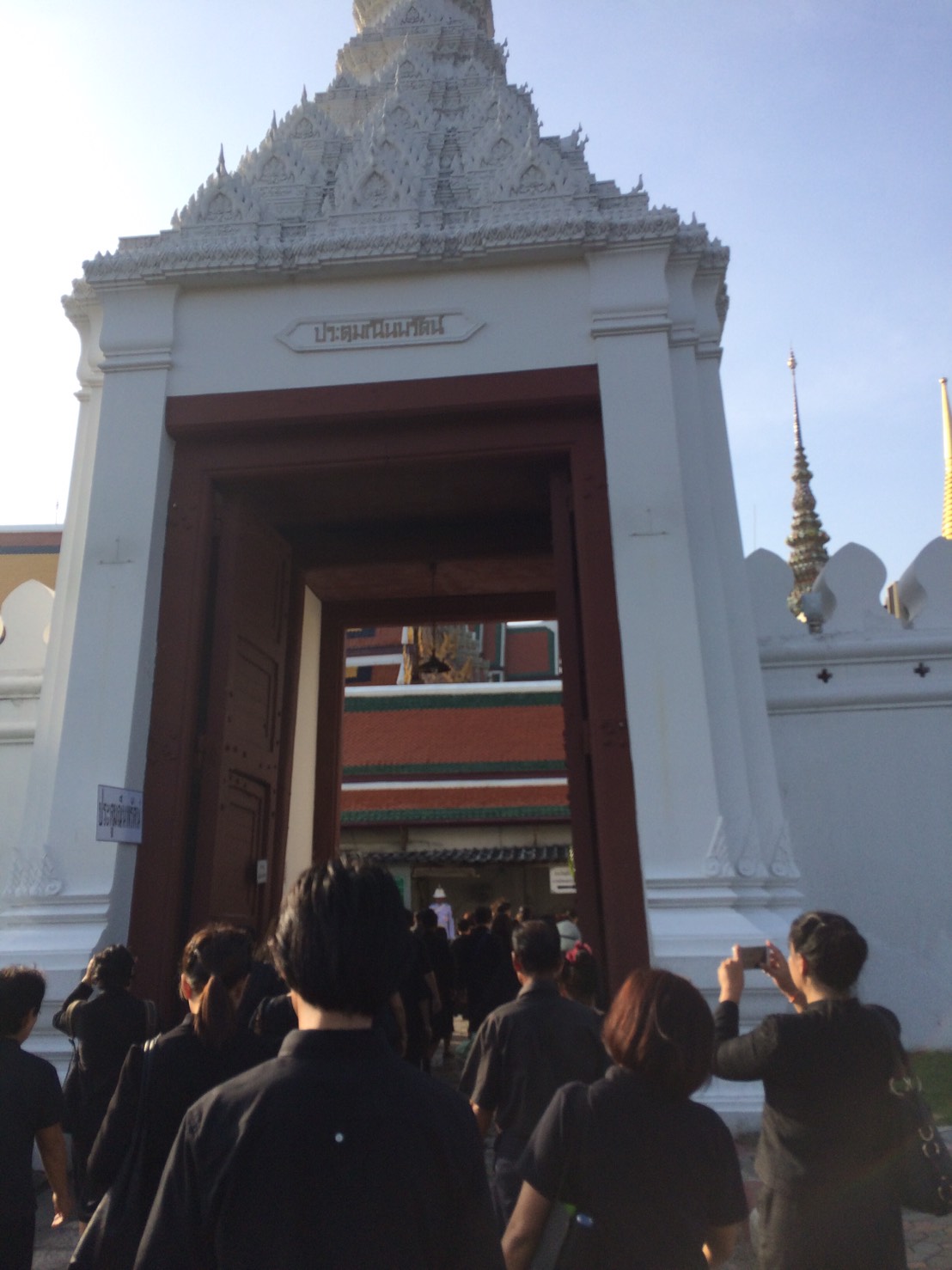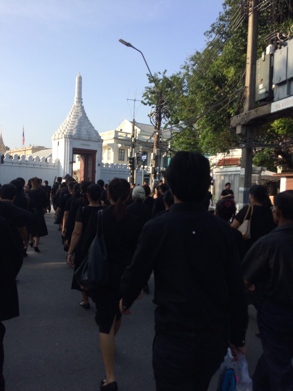 การเข้ากราบสักการะพระบรมศพพระบาทสมเด็จพระปรมินทรมหาภูมิพลอดุลเดช เมื่อวันอาทิตย์ที่ผ่านมา (20 พฤศจิกายน 2559) ตั้งใจไปกราบสักการะพระบรมศพ ในพระที่นั่งดุสิตมหาปราสาท โดยไปถึงบริเวณหน้าโรงแรมรัตนโกสินทร์ เวลา 02.30 น. ซึ่งขณะนั้น มีประชาชนจำนวนมาก เดินเต็มพื้นที่ไปหมด เพื่อตั้งแถวและจับจองพื้นที่ ตั้งแต่ริมคลองหลอด ยาวไปถึงหลังศาลฎีกา โดยปูพื้นและนั่งเรียงกันเป็นแถวตอน 4 แถว บนฟุตบาท และในส่วนของพื้นที่ รอบสนามหลวงก็เต็มไปด้วยประชาชน ที่เตรียมรอเข้าพื้นที่ด้านใน เวลาประมาณตี 3 ประชาชนเริ่มเพิ่มจำนวนมากขึ้น จนล้นลงไปที่พื้นถนน หน้าวัดบูรณศิริ พอใกล้เวลา ตี 4 ประตูสแกน วัตถุอันตราย อาวุธ ก็ได้เปิดทำการ ประชาชน เริ่มเข้าแถว ตามคิวที่นั่งรอกันไว้ จนเวลา 04.30 น. เราและเพื่อนก็ได้ผ่านประตูตรวจ จากนั้น จึงวิ่งเข้าไปในพื้นที่ท้องสนามหลวง แบบไม่รู้ว่าจะไปตรงไหน ต่างคนต่างวิ่งตามกันไป เพราะมาจากหลายประตู เมื่อเข้าสู่พื้นที่ ท้องสนามหลวง ก็จะเดินตามกันเข้าไป ตามเต๊นท์ที่กำหนดไว้ จากนั้นก็จะเข้าสู่พื้นที่ด้านใน เจ้าหน้าที่ทหาร และเจ้าหน้าที่ กรุงเทพมหานคร ก็จะแปรแถว เป็นแถวตอนเรียง 4 เพื่อเดินต่อไป ในระหว่างทาง ก็จะมีจิตอาสา น้ำกาแฟ น้ำดื่ม ไก่ทอด ข้าวเหนียว ข้าวต้มมัด ยาหอม ยาลม ยาดม มาแจก แต่เพื่อความปลอดภัย ในการเข้าห้องน้ำ ไม่ควรกินอะไรมาก มันจะลำบากตอนไปเข้าห้องน้ำ จากนั้นก็จะไปได้นั่งเก้าอี้ ซึ่งเราและเพื่อนได้ แถวที่ 5 จำนวนคนในแต่ละแถว มองอย่างต่ำน่าจะประมาณ 400 - 500 คน ซึ่งช่วงนี้ จะเป็นเวลาที่ง่วงมาก (ช่วงฟ้าสาง) จากนั้น เจ้าหน้าที่ทหาร ก็จะเริ่มทยอยพาเดิน ไปยังจุดรอคอย หน้าวัดมหาธาตุยุวราชรังสฤษดิ์ เตรียมเข้าสู่ พระบรมมหาราชวัง เราถึงหน้าประตูวิเศษไชยศรี เวลา 08.00 น. ได้เวลาเคารพเพลงชาติ จากนั้นเจ้าหน้าที่ จะพาเดินไปที่ประตู มณีนพรัตน์ เข้าสู่ คดระเบียงวัดพระศรีรัตนศาสดาราม (วัดพระแก้ว) ในช่วงนี้ จะได้ชื่นชมกับความงดงามของสถาปัตยกรรมไทย และภาพจิตรกรรมรามเกียรติ์ จากนั้นจะเกินออกสู่พื้นที่ พระบรมมหาราชวัง ผ่าน พระที่นั่งอมรินทรวินิจฉัย พระที่นั่งจักรีมหาปราสาท และเตรียมตัวเข้าสู่บริเวณพระที่นั่งดุสิตมหาปราสาท เมื่อเข้าเขตพื้นที่ เจ้าหน้าที่สำนักพระราชวัง จะแจกถุงสีดำ เพื่อใส่รองเท้า และเตรียมแปรแถวเพื่อขึ้นสู่ด้านบน ในช่วงนี้ เพื่อเป็นการถวายความเคารพ โปรดงดใช้โทรศัพท์หรือกล้อง ทำการบันทึกภาพ จากนั้นเจ้าหน้าที่ จะแบ่งออกเป็น 2 กลุ่ม ๆละ 2 แถว เพื่อขึ้นสู่ด้านบนพระที่นั่งดุสิตมหาปร