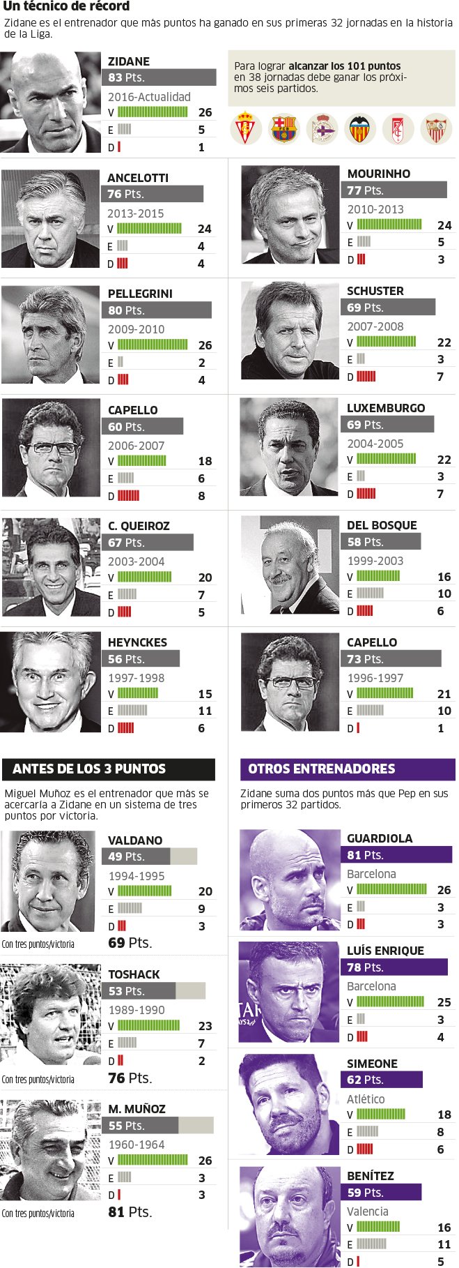 อันดับ 2 คือ เป๊ป กวาร์ดิโอล่า คุม บาร์เซโลน่า ลงเล่นลา ลีก้า 32 นัดแรกโกย 81 แต้มแพ้ ซีดาน เฉียดฉิวส่วนอันดับ 3 คือ มานูเอล เปเญกรินี่ คุม มาดริด ซีซั่นเดียวคือ 2009/10 32 นัดแรกกดไป 80 แต้ม