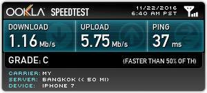 ช่วงแรกสัญญาณดีวิ่งเร็วมาก หลังจาก วันศุกร์ที่ 18 พฤศจิกายน 2559 ช่วงเวลาประมาณ1-2ทุ่ม ที่สัญญาณเครือข่ายมีปัญหาใช้อินเน็ตกันไม่ได้เป็นเวลา30ถึง1ชม ทำให้หลังจากนั้นเป็นต้นมา สัญญาณ4Gที่ใช้ก็ความเร็วลดลงอย่างเห็นได้ชัดตลอดเวลา ได้ทำการวัดความเร็วอินเตอร์เน็ตโดยใช้แอปพีเคชั่น Speedtest ที่ผิดสังเกตุ คือ ค่า Downlong วิ่งช้า กว่าค่า Uplong ซึ่งปกติ ค่า Donwlong จะเร็วกว่าค่า Uplong มากเป็นปกติ มีอาการมา 4 วันแล้ว ใช้ งานโดย iPhone 7 สองเครื่อง เป็นเหมือนกันทั้งสองเครื่องซึ่งตัวเครื่องและซิมปกติไม่น่าจะมีปัญหาใดๆ