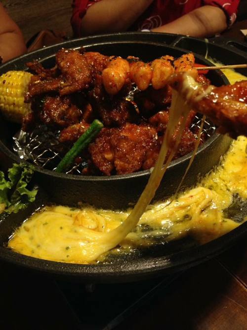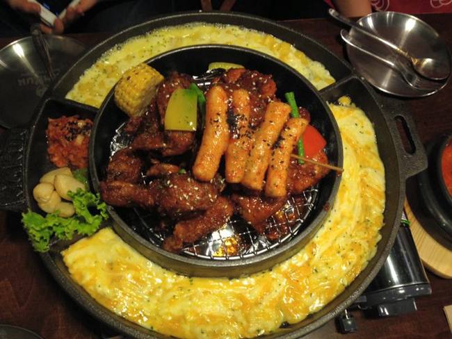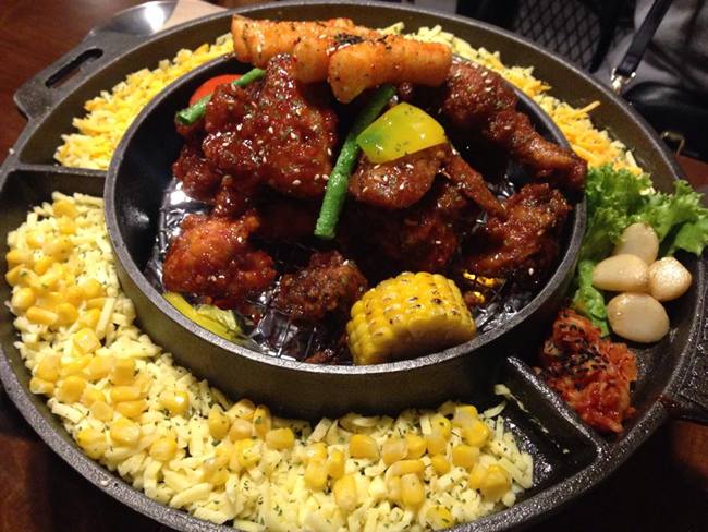 รอ ไม่นานอาหารก็ยกมาเสิร์ฟ OMG! มาเป็นกระทะร้อนเลยจ้า ไก่ทอด 1 ตัว แบ่งเป็น 2 รสชาติตามที่สั่งไป เสิร์ฟมาพร้อมข้าวโพด ต๊อกโบกีทอด และชีส