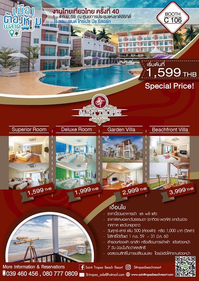 ขาย gift voucher Saint Tropez จันทบุรี 2 คืน ซื้อที่งานไทยเที่ยวไทย ใช้ได้ถึง 31 มีนาคม 60