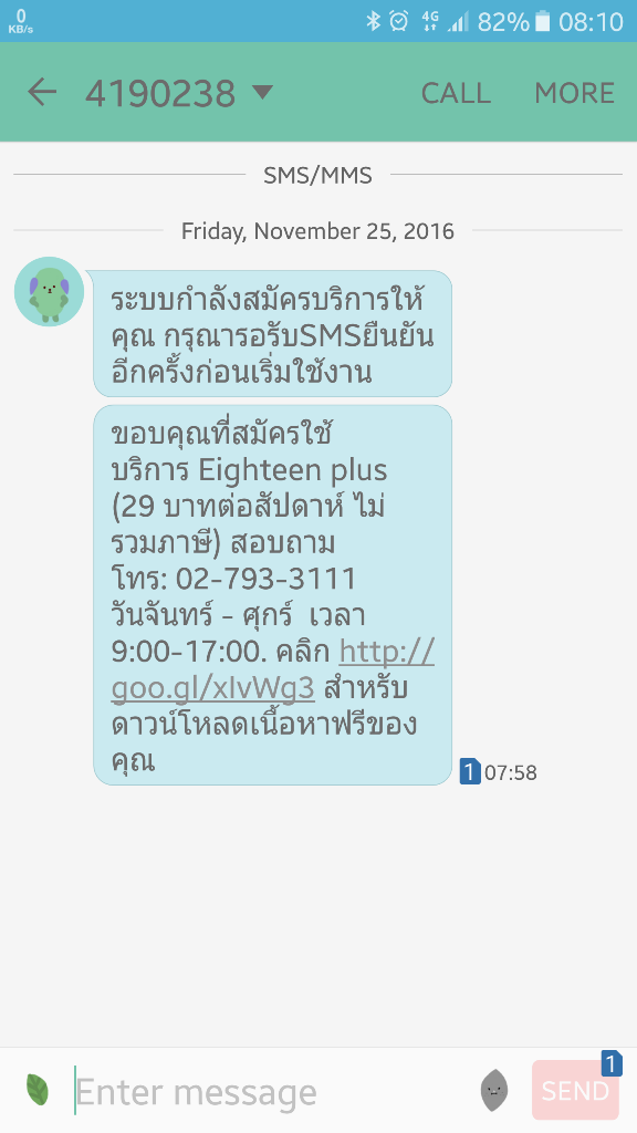 เดือนที่แล้วก็สมัครให้เอง มีข้อความเข้ามาว่าขอบคุณที่ใช้บริการเท่านั้นแหละข้อความมาเลย 9 บาททันที ก็ต้องโทรยกเลิกเสียเวลาทำมาหาหกิน