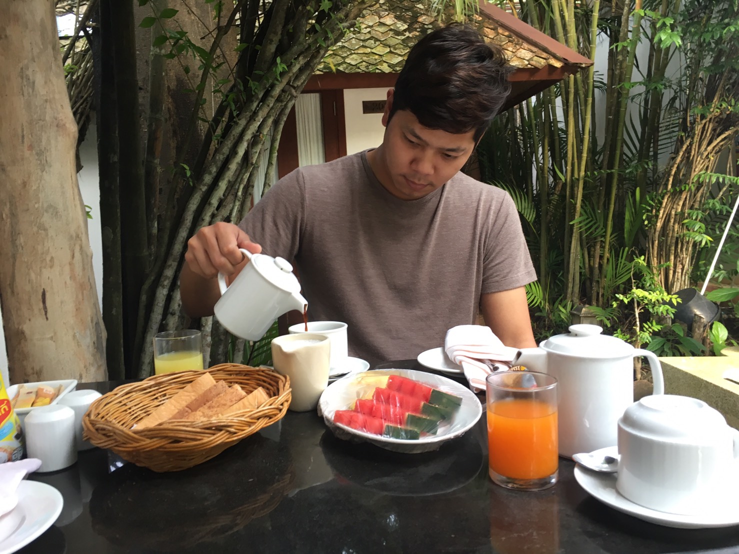 07.00 พนักงานมาเคาะห้อง อาหารเช้าพร้อมเสริฟ ของที่นี่มีอาหารเช้าให้ แต่ต้องสั่งไว้ก่อน ไม่มี ออล ยู แคน - นะจร้ะ เลือกเมนูไว้ ข้าวต้มหมู พนักงานวางจานปุ้ป หมูมา แต่ว่า นี่มัน "ข้าวผัด" ถามมาได้ความว่า จดผิด แต่พนักงานดี น่ารัก อะเค ให้อำภัย เพราะไงก็กินได้ไม่เยอะ