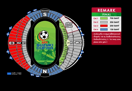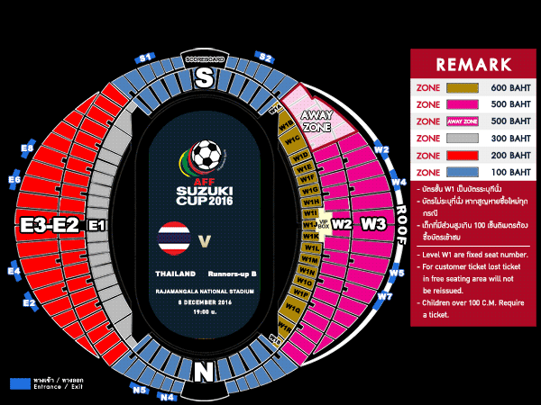 สนามราชมังคลากีฬาสถาน แข่งเวลา 19.00/19.30 ทุกนัด โซน W1 ระบุที่นั่งทุกที่นั่ง ราคา 700 บาท โซน W2-3 ไม่ระบุที่นั่ง ราคา 500 บาท โซน E1 ระบุที่นั่งทุกที่นั่ง รา