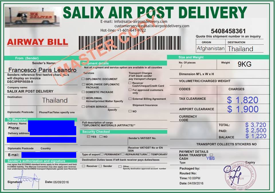 นี่คือใบส่งของที่ฝรั่งส่งมาให้ค่ะ (ขอเซ็นเซอร์ชื่อผู้รับนะคะ)