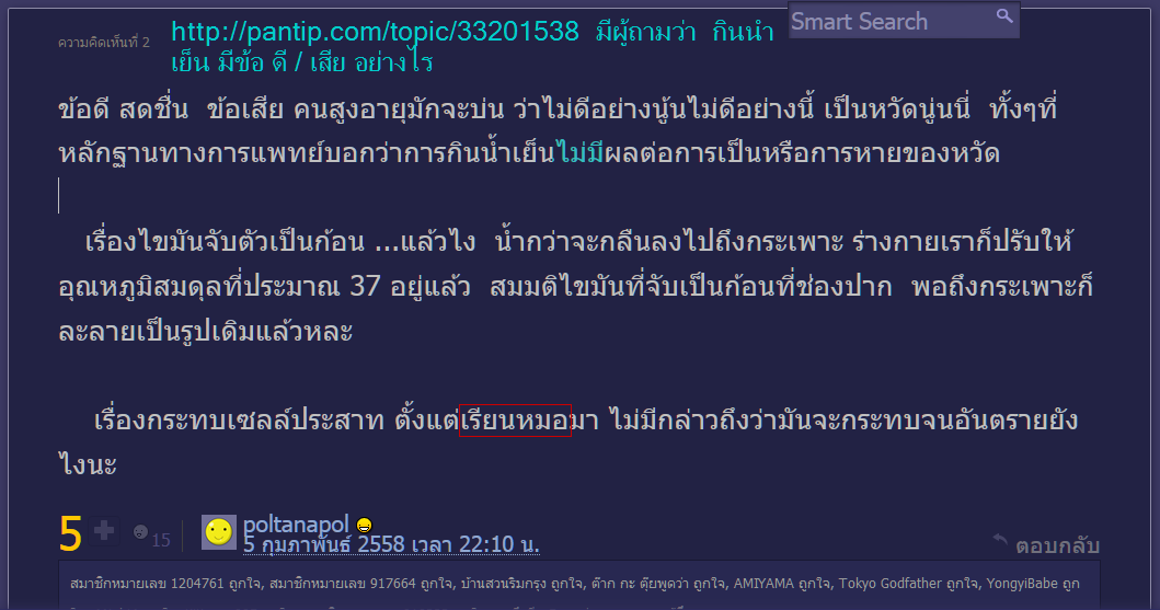 นอกจากนั้น ความเห็นที่ 2 ที่ http://pantip.com/topic/33201538 ของหัวข้อกระทู้ 'การดื่มน้ำเย็น มี ข้อดี / เสีย อย่างไร' ก็เป็นความเห็นที่สอดคล้องกับของผม ดังภาพ: