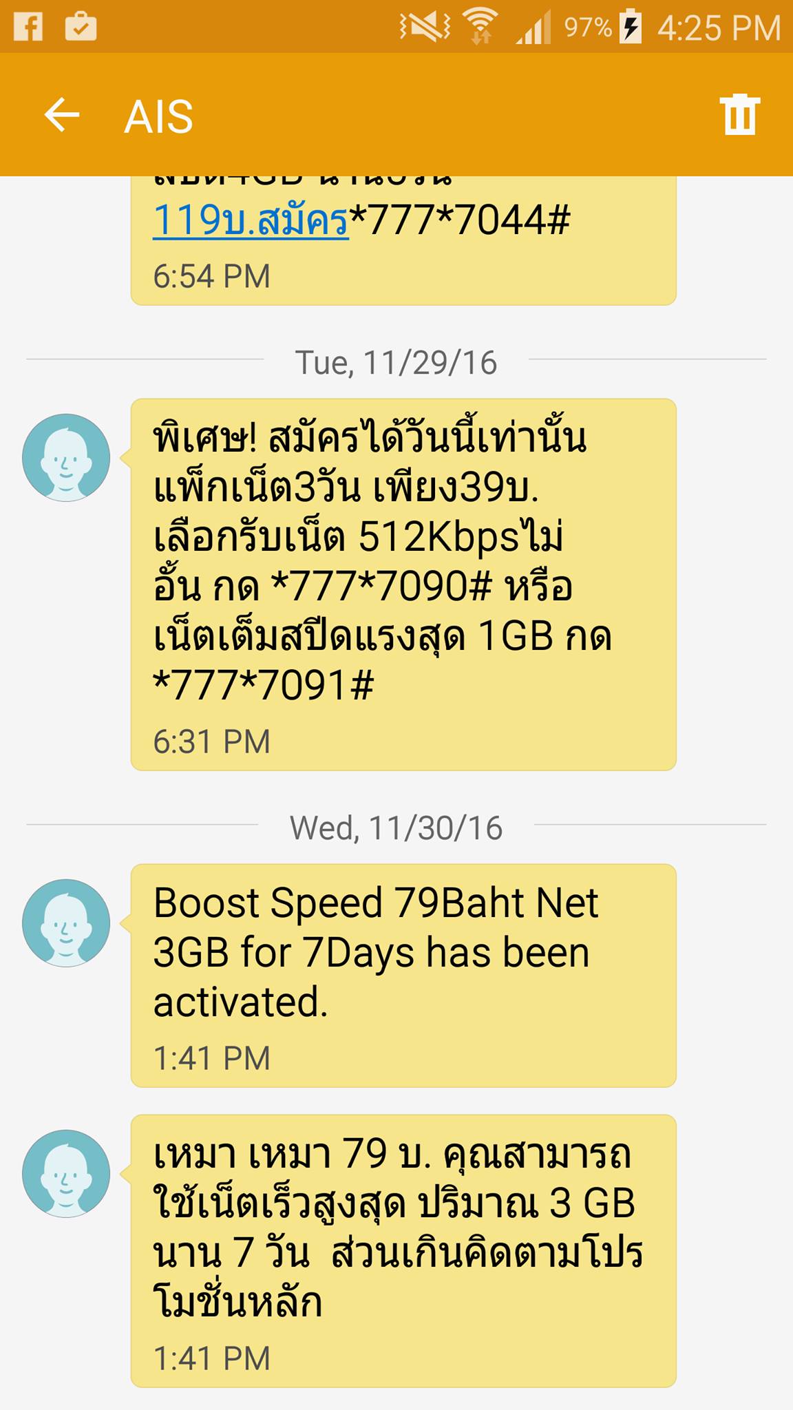 ปกติใช้เน็ตจากซิมทรู ais ไว้โทร รับสาย อยู่ๆ มีข้อความ วันนี้คุณใช้เน็ตไปประมาณ 10 บาทแล้ว ใช้ถึง 49 บาทจะใช้เน็ตฟรีได้ถึงเที่ยงคืน หรือซื้อแพ็กเน็ต 25บ. เน็ต 1.5GB ใช้ได้ 24ชม. สมัครกด *777*7503# หรื