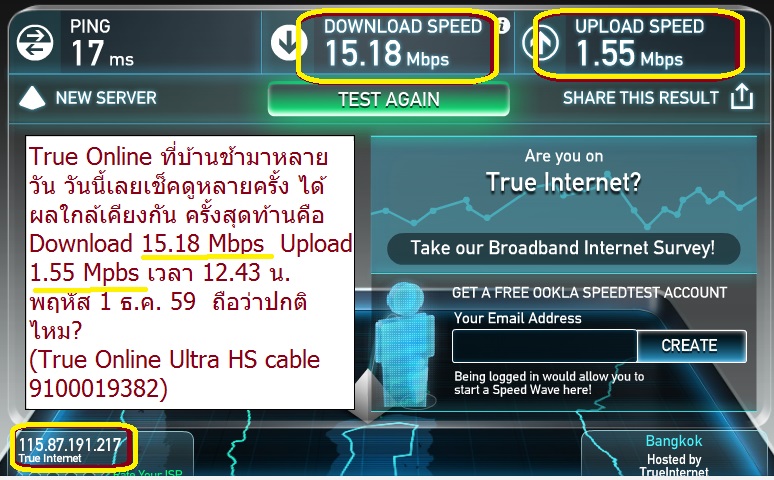 True Online ที่บ้านช้ามาหลายวัน วันนี้เลยเช็คดูหลายครั้ง ได้ผลใกล้เคียงกัน ครั้งสุดท้ายคือ Download 15.18 Mbps Upload 1.55 Mpbs เวลา 12.43 น. พฤหัส 1 ธ.ค. 59 ถือว่าปกติไหม?
