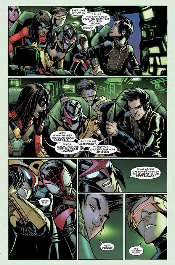 ปากีสถานมีเหตุด่วนเหตุร้าย ทีมแชมเปี้ยนส์จึงขับยานไปที่นั่น (ผมว่าแม้ดดี้ไม่ควรโผล่มาในตอนที่ 1 เลยนะ เพราะทะเลาะกับโชใน Civil War II นี่พอหลังตอน 2 มา...หายเนียนเลย) ระหว่างทางก็เถียงกันว่าใครเป็นหัวหน้าทีม (โนว่าแหย่เล่นด้วยการเสนอสก๊อต)