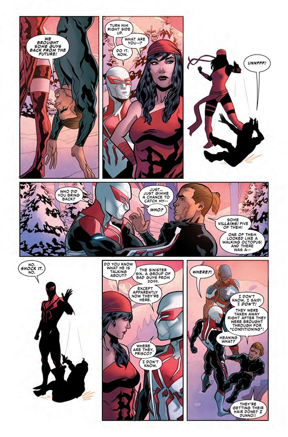 อีเล็คตร้าข่มขู่ไอร์ออนแมน 2099 ให้เล่าเรื่องราวมาซะ ด้วยการจับห้อยหัวยื่นไปกลางหน้าผา (โหดจริง) โรเบอร์ต้าบอกมิเกลให้ห้ามเจ๊โหดคนนี้หน่อย พอไกล่เกลี่ยได้ ไอร์ออนแมน 2099 ก็ยอมเล่าว่าซินิสเตอร์ซิกส์จากปี 2099 มาที่นี่ แต่ก็หายไปแล้ว