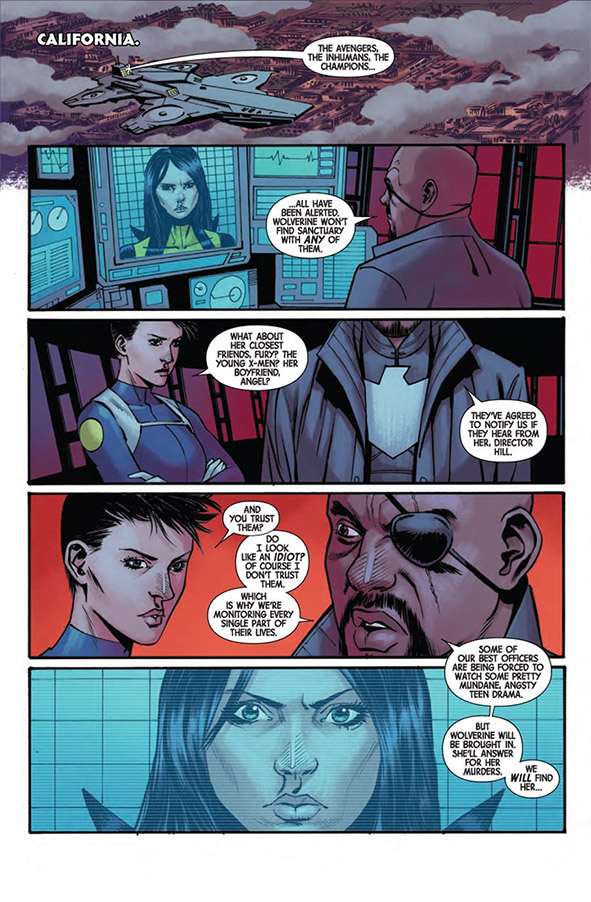 นิคฟิวรี่บอกทีมฮีโร่ทั้งหลาย อเวนเจอร์ส อินฮิวแมน แชมเปี้ยนส์ และเอ็กซ์เมน ให้สอดส่องดูลอร่า เจอเมือไหร่ติดต่อมาทันที (เอ่อ เพ่ก็น่าจะรู้ว่าเจ๊เขาไปมาดริปัวร์นะ หรือแค่ดักรอที่ประเทศนั้นก็ทำไม่ได้หว่า)