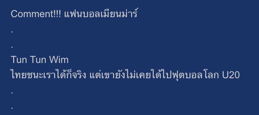 แฟนบอลเมียนมาร์ : "ไทยชนะเราได้ก็จริง แต่เขายังไม่เคยได้ไปฟุตบอลโลก U-20" คุณคิดเห็นอย่างไรบ้างครับ ?