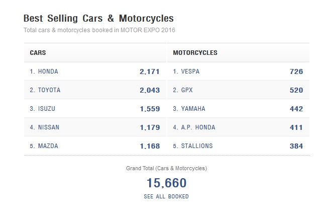 Best Selling Cars & Motorcycles Total cars & motorcycles booked in MOTOR EXPO 2016