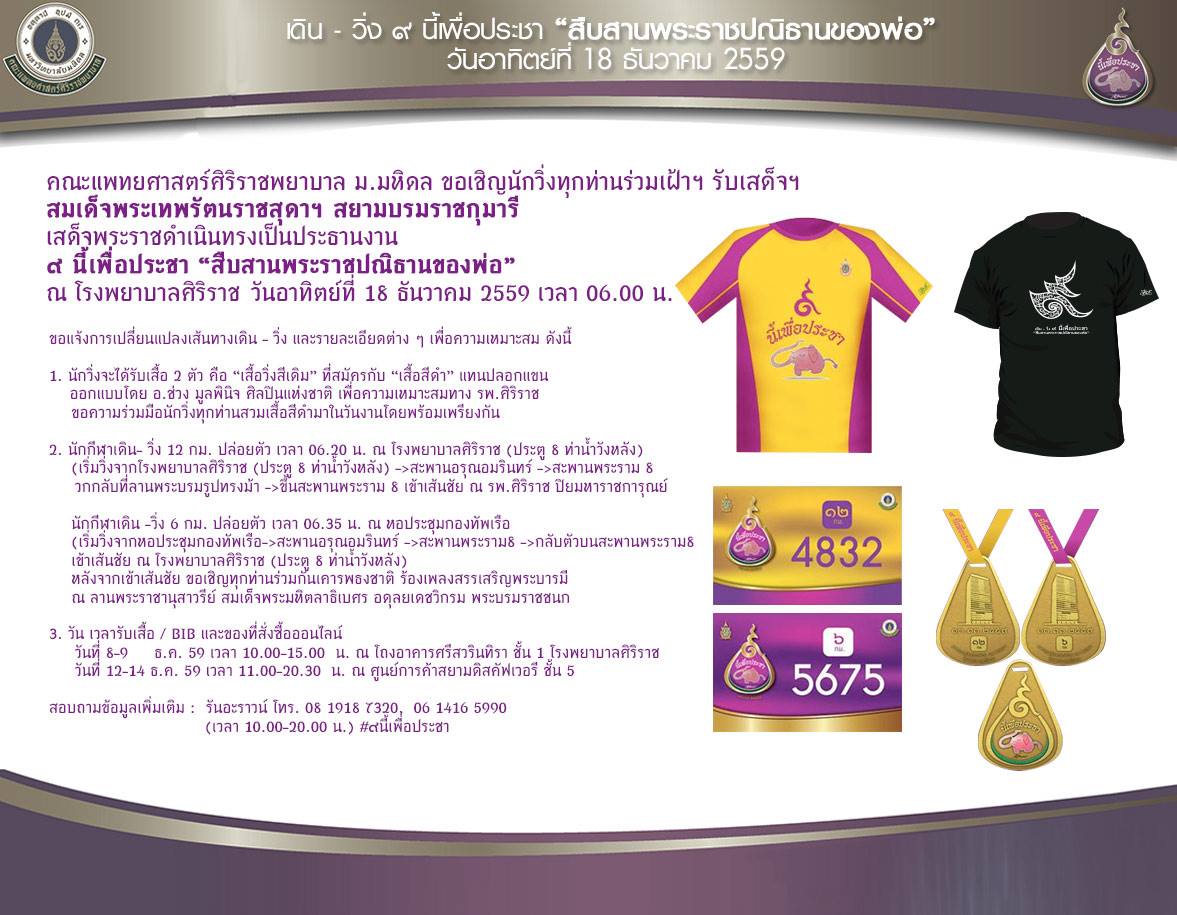 1. นักวิ่งจะได้รับเสื้อ 2 ตัว คือ “เสื้อวิ่งสีเดิม” ที่สมัครกับ “เสื้อสีดำ” แทนปลอกแขนออกแบบโดย อ.ช่วง มูลพินิจ ศิลปินแห่งชาติ เพื่อความเหมาะสมทาง รพ.ศิริราช ขอความร่วมมือนักวิ่งทุกท่านสวมเสื้อสีดำมาในวันงานโดยพร้อมเพรียงกัน