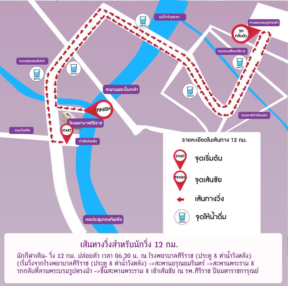 2. นักกีฬาเดิน- วิ่ง 12 กม. ปล่อยตัว เวลา 06.20 น. ณ โรงพยาบาลศิริราช (ประตู 8 ท่าน้ำวังหลัง) (เริ่มวิ่งจากโรงพยาบาลศิริราช (ประตู 8 ท่าน้ำวังหลัง) ->สะพานอรุณอมรินทร์ ->สะพานพระราม 8 -> วกกลับที่ลานพระบรมรูปทรงม้า ->ขึ้นสะพานพระราม 8 เข้าเส้นชัย ณ รพ.ศิริราช ปิยมหาราชการุณย์