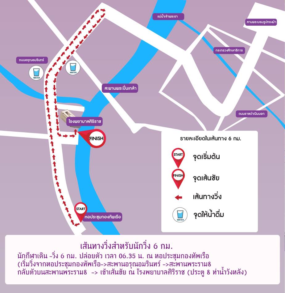 (เริ่มวิ่งจากหอประชุมกองทัพเรือ->สะพานอรุณอมรินทร์ ->สะพานพระราม8 ->กลับตัวบนสะพานพระราม8 เข้าเส้นชัย ณ โรงพยาบาลศิริราช (ประตู 8 ท่าน้ำวังหลัง)