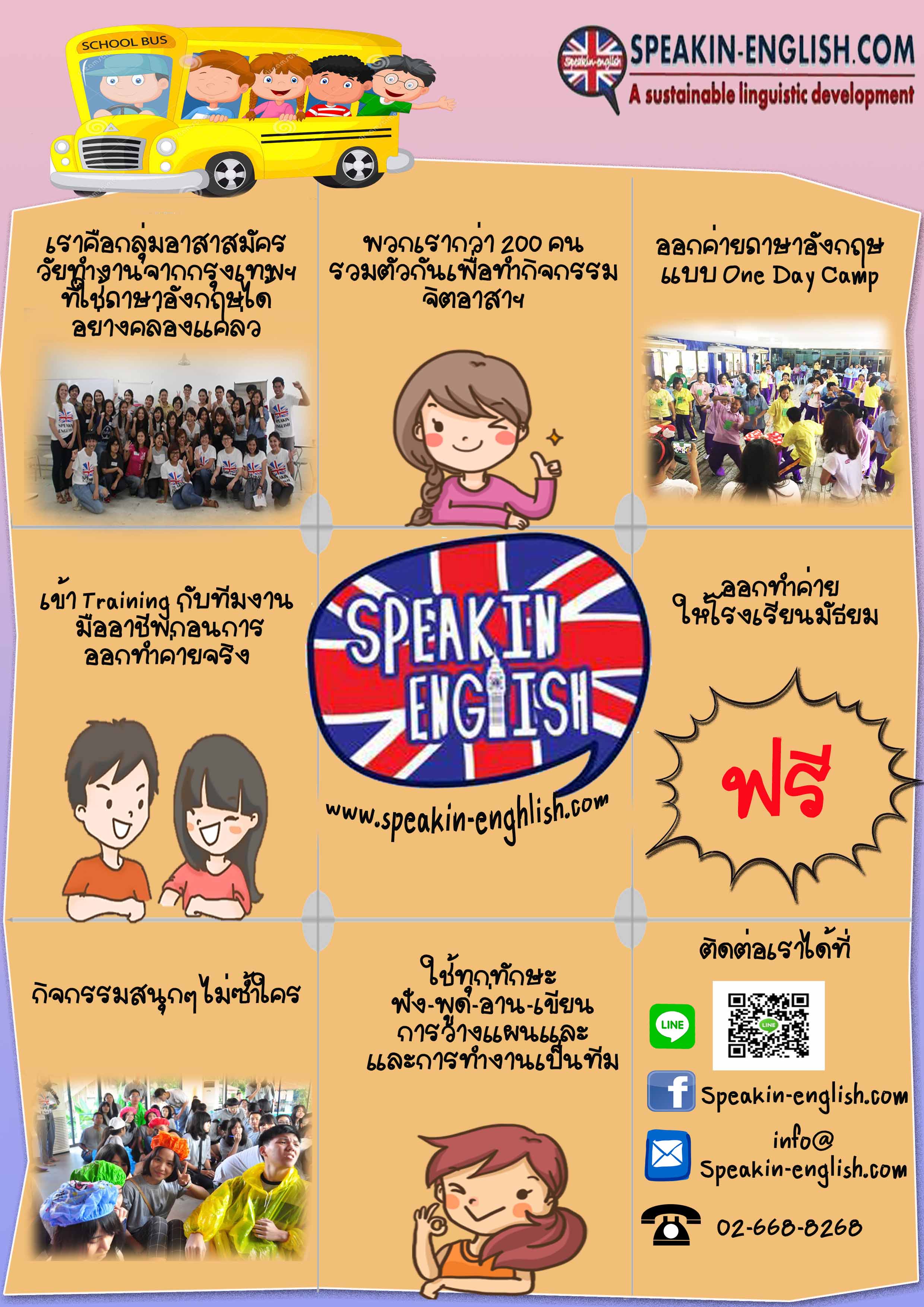"โครงการ speakin-english.com"เป็นโครงการค่ายอาสาภาษาอังกฤษ เข้าทำกิจกรรมจัดค่ายให้กับโรงเรียนมัธยม ทั้งใน กทม.และต่างจังหวัด โดยไม่มีเสียค่าใช้จ่าย ฟรีค่ะฟรี ฟรีตัวโตๆกันเล้ยย ใครรู้จักครูบาอาจารย์ รุ่นพี่คนไหน อยากให้รุ่นน้องโรงเรียนตัวเองได้รับความรู้ ได้รับสิ่งดีๆ แชร์ต่อไปให้อาจารย์ ส่งต่อไปให้โรงเรียน ได้เลยนะคะ หากมีโรงเรียน ครู อาจารย์ท่านใดสนใจ ให้เราเข้าจัดค่ายให้ ติดมาได้เลยค่ะ inbox สอบถามข้อมูลได้ตลอดค่ะ ฝากแชร์ๆๆกันต่อหน่อยน้าาาาา