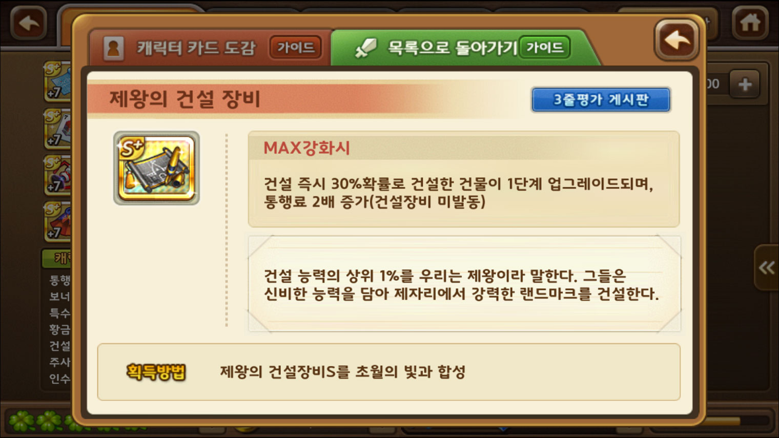 ความสามารถ : เมื่อก่อสร้างอาคาร โอกาส30% อัพเกรดอาคารเพิ่ม1ระดับ และเพิ่มค่าผ่านทาง2เท่า (อุปกรณ์เขียนแบบไม่ทำงาน)