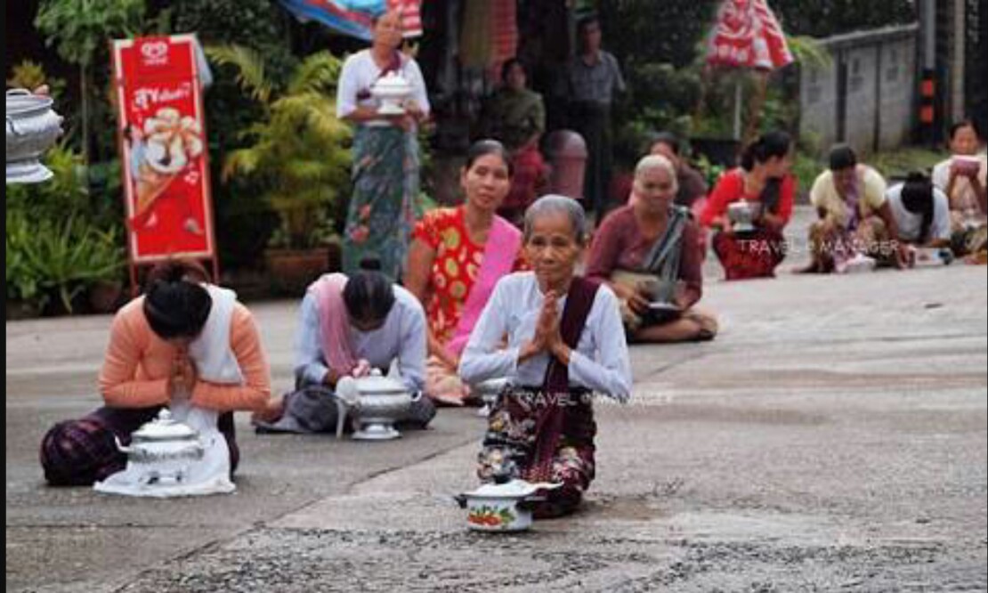 แล้วเล่าว่าผู้เฒ่าผู้แก่และชาวมอญมีความเลื่อมใสศรัทธาในพระพุทธศาสนามากทุกเช้าพวกเขาจะเตรียมอาหารอย่างประณีตเพื่อรอใส่บาตรโดยนั่งพับเพียบกับพื้นถนนที่เก็บกวาดอย่างดีรอคอยการมาโปรดของพระภิกษุสามเณรผ่านหน้าบ้านไปให้เกิดมงคล เขาไม่ปูเสื่อเป็นความเชื่อเดียวกับการถอดรองเท้าด้วยความเคารพในทานทั้งผู้ให้ผู้รับอยู่บนพื้นเดียวกันจึงไม่ปูเสื่อด้วยเพราะจะแลดูสูงกว่าพระผู้มาโปรดที่ท่านเดินมาด้วยเท้าเปล่า