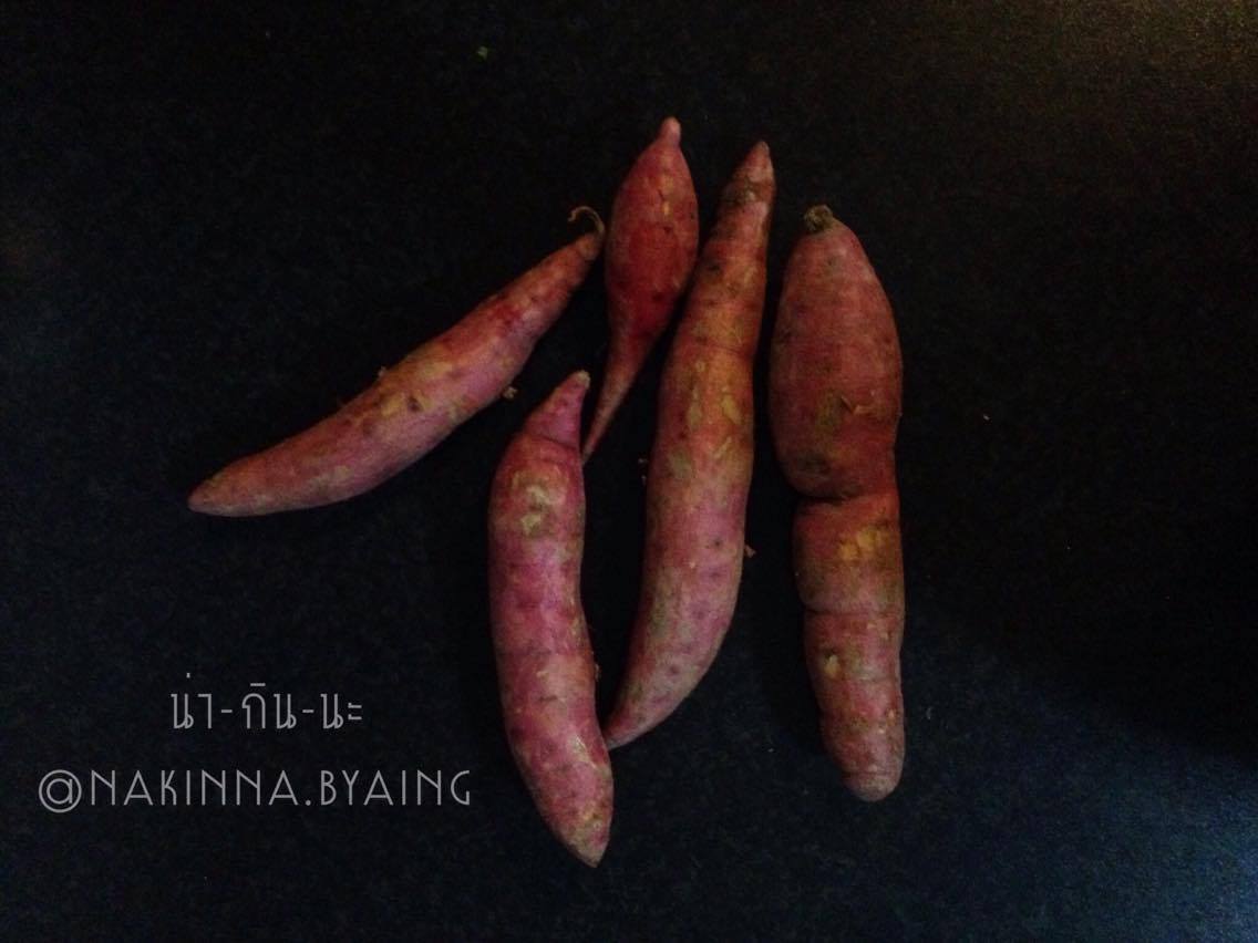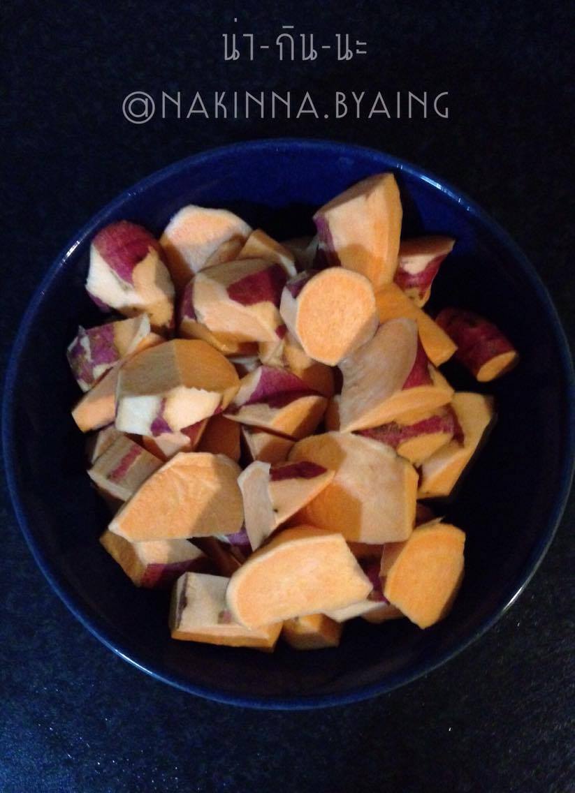 1. ล้างมันเทศให้สะอาด ปอกเปลือกให้มีเปลือกเหลือไว้บ้าง หรือใครจะปอกออกหมดกก็ไม่ว่ากัน เสร็จแล้วหั่นเป็นชิ้นพอคำ