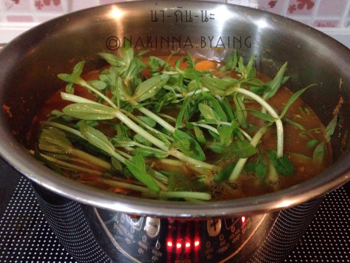 6. ต้มจนมันเทศสุก ใส่ผักขะแยง ลงไป คนให้เข้ากันแล้วยกลง