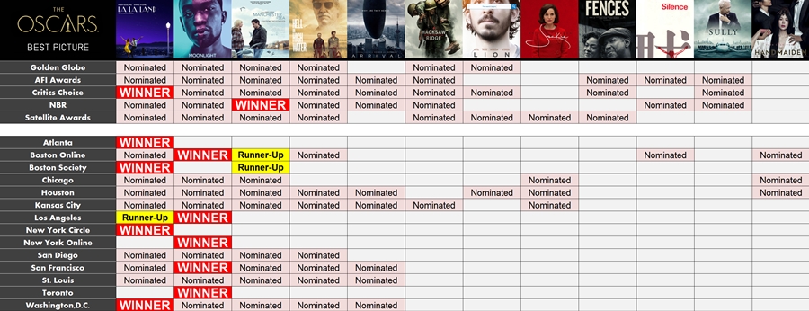 Manchester by the Sea ที่คว้ารางวัลใหญ่จาก NBR แต่ในส่วนของสถาบันวิจารณ์หนัง เรื่องนี้ยังไม่ผงาดอย่างที่คาดการณ์ไว้ เพราะยังไม่ได้ชนะเลยซักสถาบัน (แต่ก็เข้าชิงทุกสถาบัน)